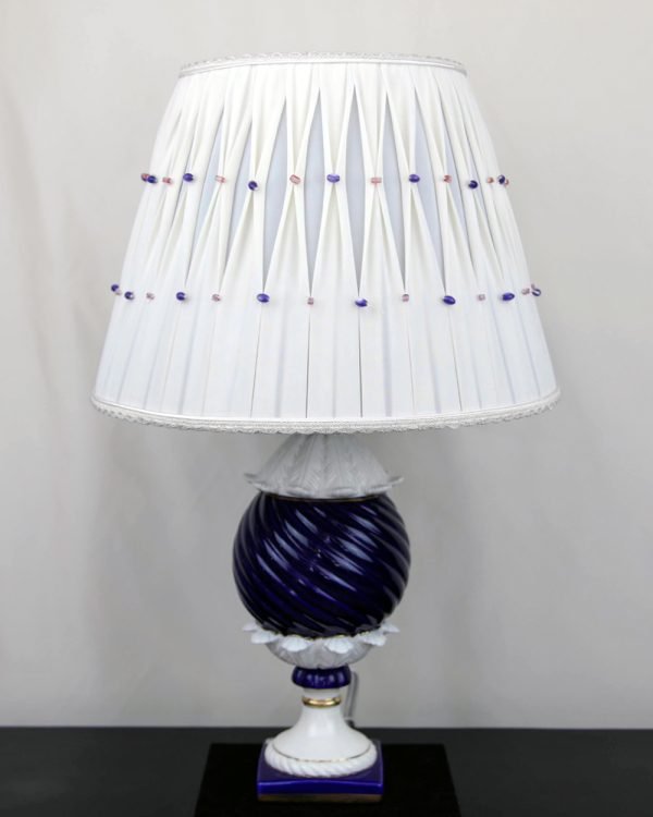 Lampada con base in porcellana bianca e blu e paralume modello pizzicato con perline.