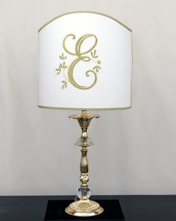 Lampada in ottone e cristallo con paralume a ventola con iniziale ricamata