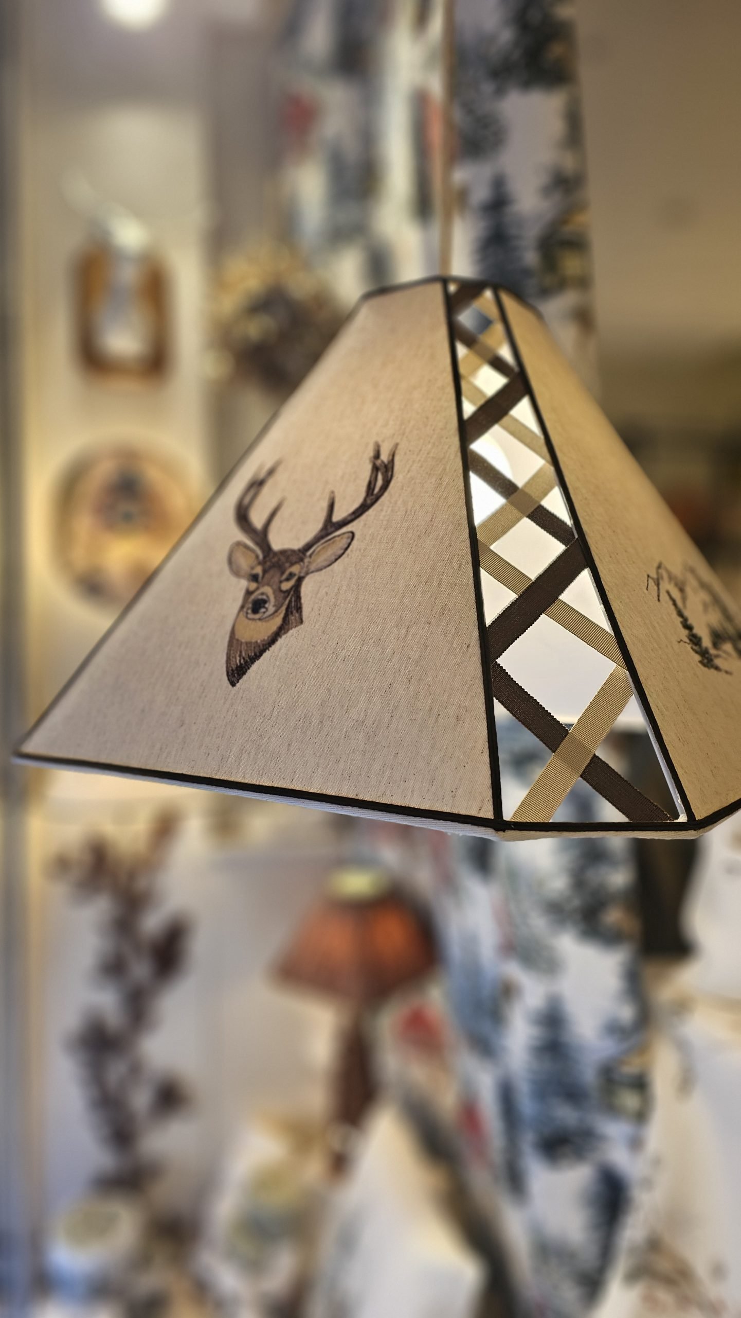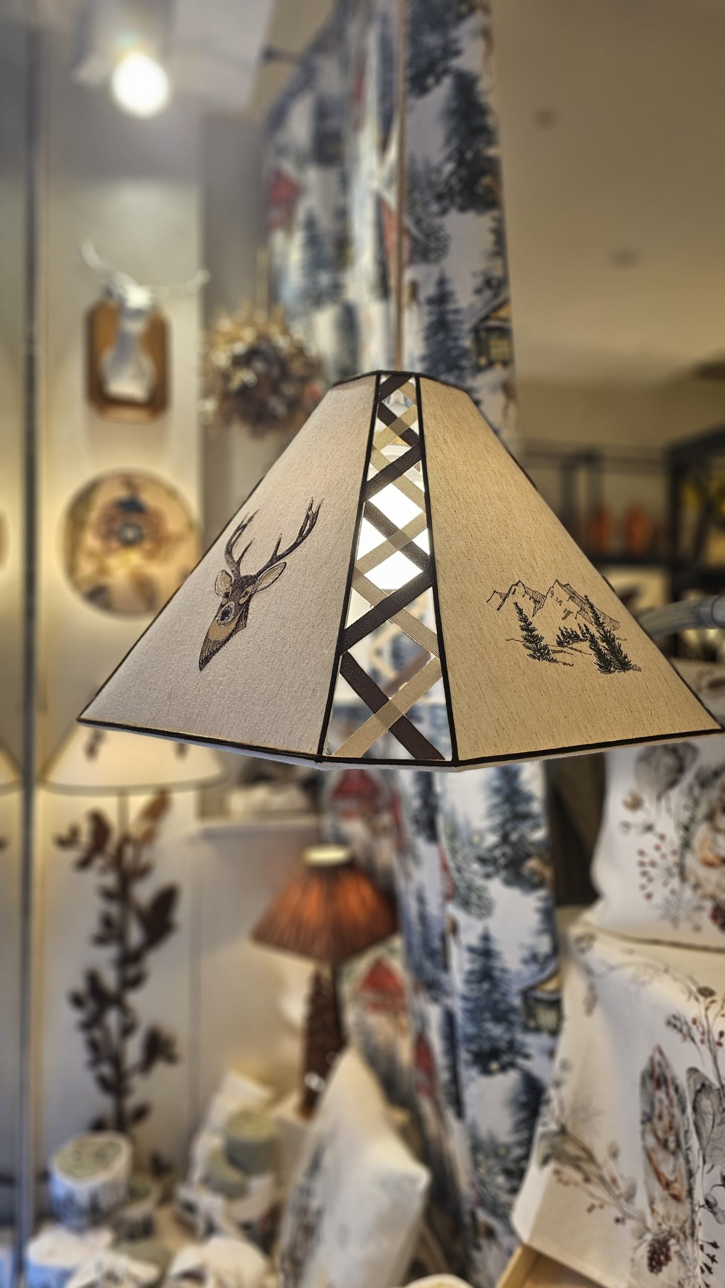Ogni lampadario è un’opera d’arte: il paralume è confezionato in lino preincollato su PVC, un materiale che garantisce durata e una diffusione della luce morbida e accogliente. Il cuore del design è il ricamo a macchina, che dà vita a un affascinante soggetto di cervi e montagne, catturando l’essenza del paesaggio alpino.